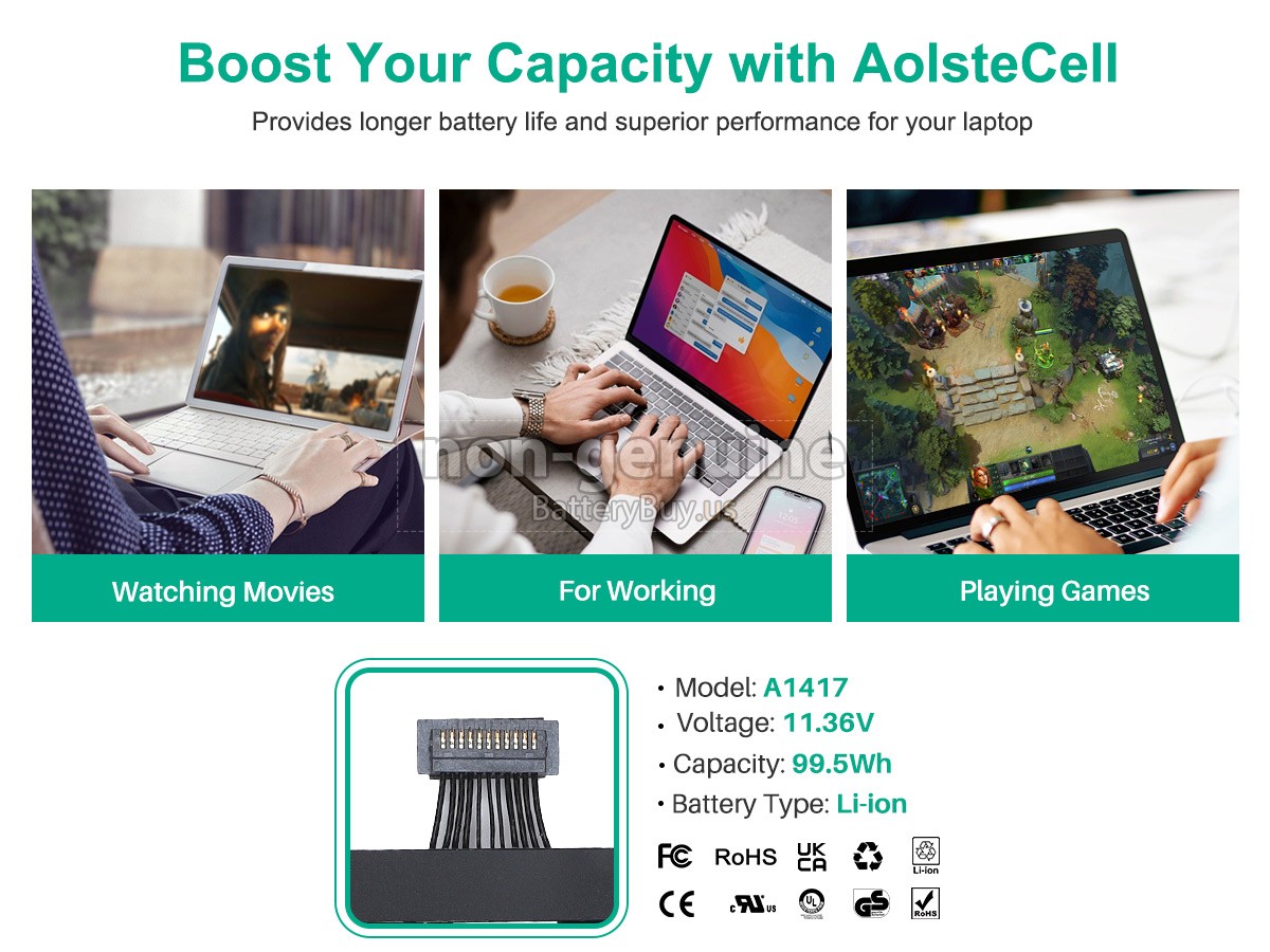 With first-class quality assurance, the battery for Apple MacBook Pro Core I7 2.4GHZ 15.5 inch Retina A1398(EMC 2673) provides protections of voltage, short circuit, charging time, ESD, and so on. Each Apple MacBook Pro Core I7 2.4GHZ 15.5 inch Retina A1398(EMC 2673) laptop battery has passed a series of safety certifications, such as CE, UL, ROHS, ISO9001/9002. It will be rigorously tested by our technicians before being shipped to your hands. We will try our best to select a high-quality Apple MacBook Pro Core I7 2.4GHZ 15.5 inch Retina A1398(EMC 2673) battery for you.