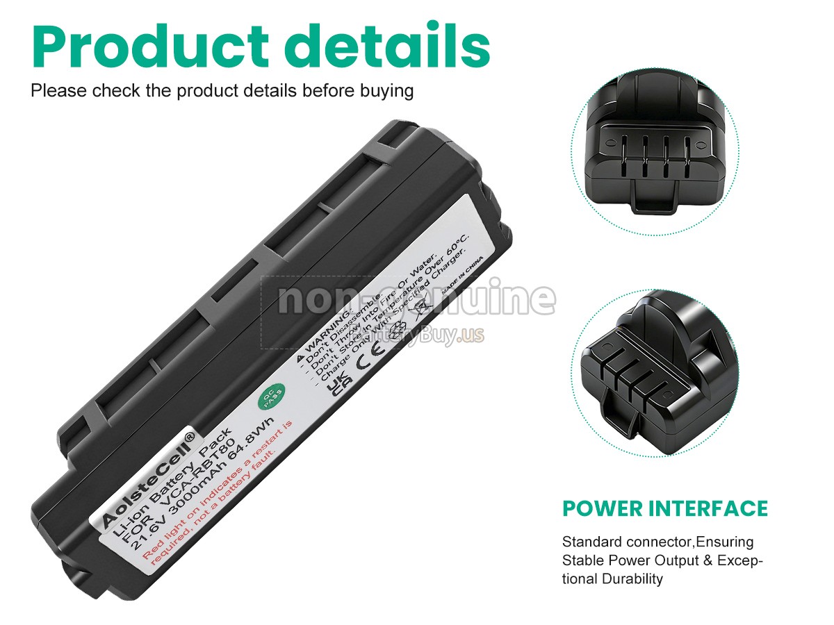 The replacement battery for Samsung VCA-RBT80 from BatteryBuy.us will be your best choice. We offer a high-quality cordless vacuum cleaner battery at a more reasonable price. Our Samsung VCA-RBT80 batteries can be charged/discharged for at least 600 cycles. Being made of ABS plastic case and the original IC protection chip, it could give you the new experience of excellent durability.