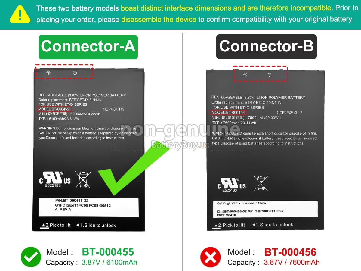 The replacement battery for Zebra ET4X from BatteryBuy.us will be your best choice. We offer a high-quality battery at a more reasonable price. Our Zebra ET4X batteries can be charged/discharged for at least 600 cycles. Being made of ABS plastic case and the original IC protection chip, it could give you the new experience of excellent durability.