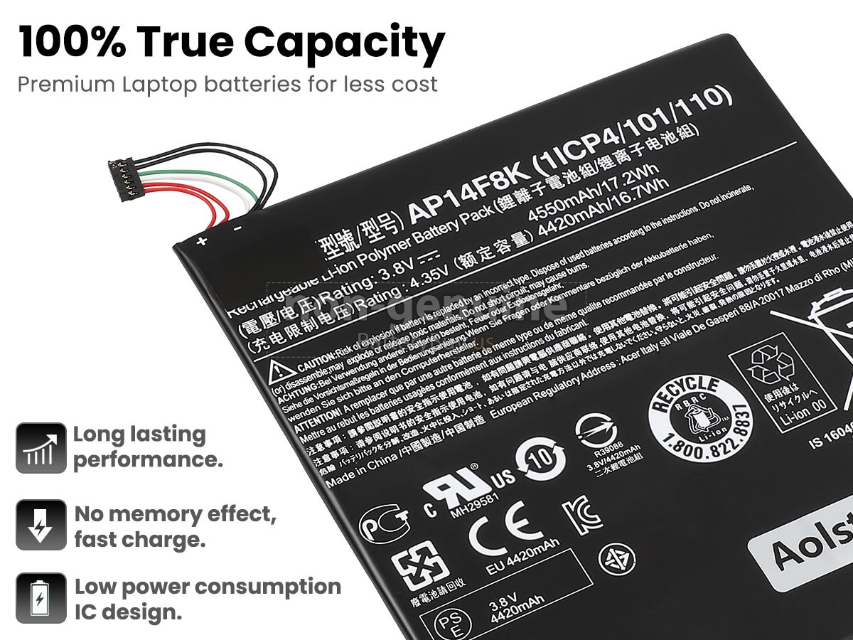 With first-class quality assurance, the battery for Acer Iconia Tab A1-850 provides protections of voltage, short circuit, charging time, ESD, and so on. Each Acer Iconia Tab A1-850 laptop battery has passed a series of safety certifications, such as CE, UL, ROHS, ISO9001/9002. It will be rigorously tested by our technicians before being shipped to your hands. We will try our best to select a high-quality Acer Iconia Tab A1-850 battery for you.