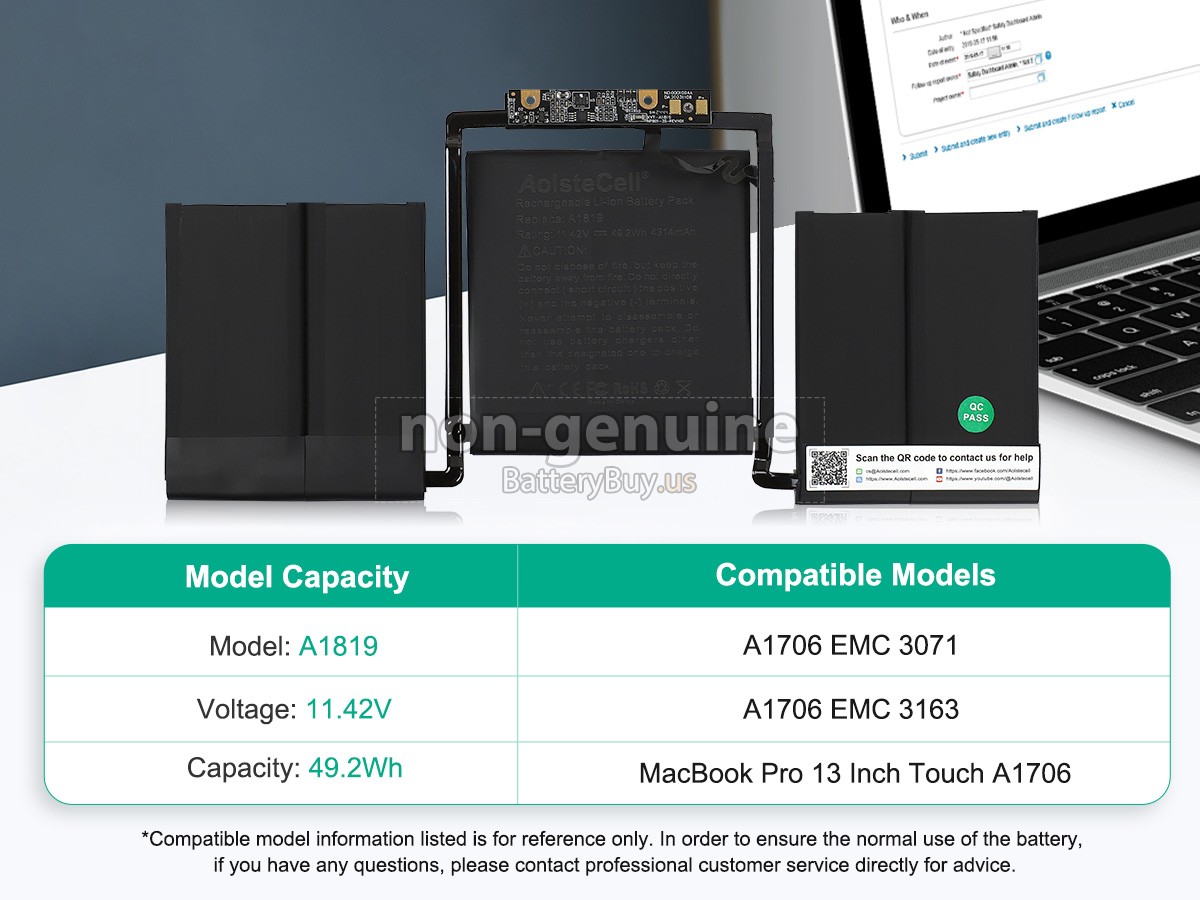 A: Through the product compatibility table, you can check if Apple A1706 EMC 3071 replacement battery is compatible with your laptop model. Clicking product larger Images, you can confirm the selected correctness of Apple A1706 EMC 3071 laptop battery. What's more, please pay attention to check if the voltage (rated value) is the same as your old one. For more details, please click How to find one correct battery for my laptop?