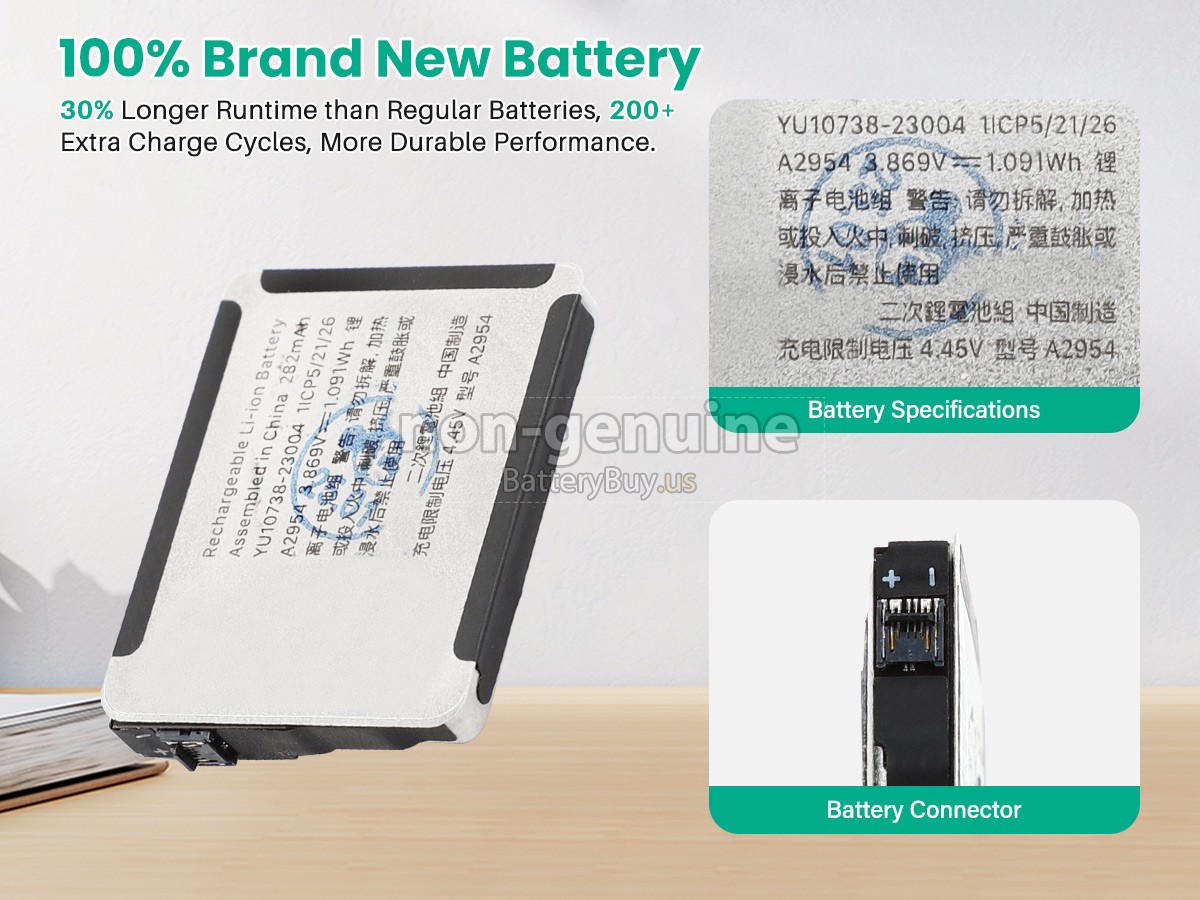 The replacement battery for Apple A2954 from BatteryBuy.us will be your best choice. We offer a high-quality watch battery at a more reasonable price. Our Apple A2954 batteries can be charged/discharged for at least 600 cycles. Being made of ABS plastic case and the original IC protection chip, it could give you the new experience of excellent durability.