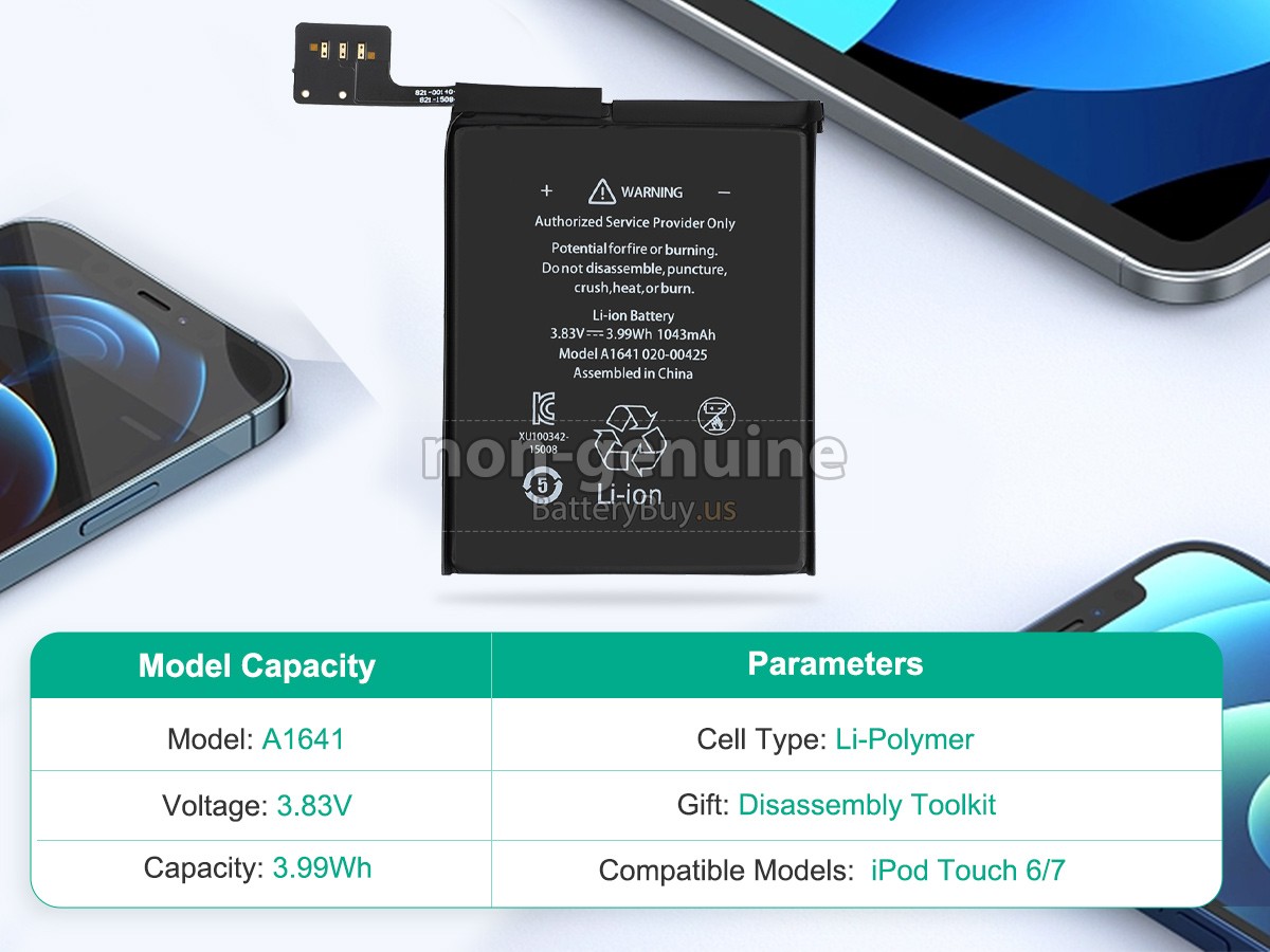 With first-class quality assurance, the battery for Apple IPOD TOUCH7 provides protections of voltage, short circuit, charging time, ESD, and so on. Each Apple IPOD TOUCH7 battery has passed a series of safety certifications, such as CE, UL, ROHS, ISO9001/9002. It will be rigorously tested by our technicians before being shipped to your hands. We will try our best to select a high-quality Apple IPOD TOUCH7 battery for you.