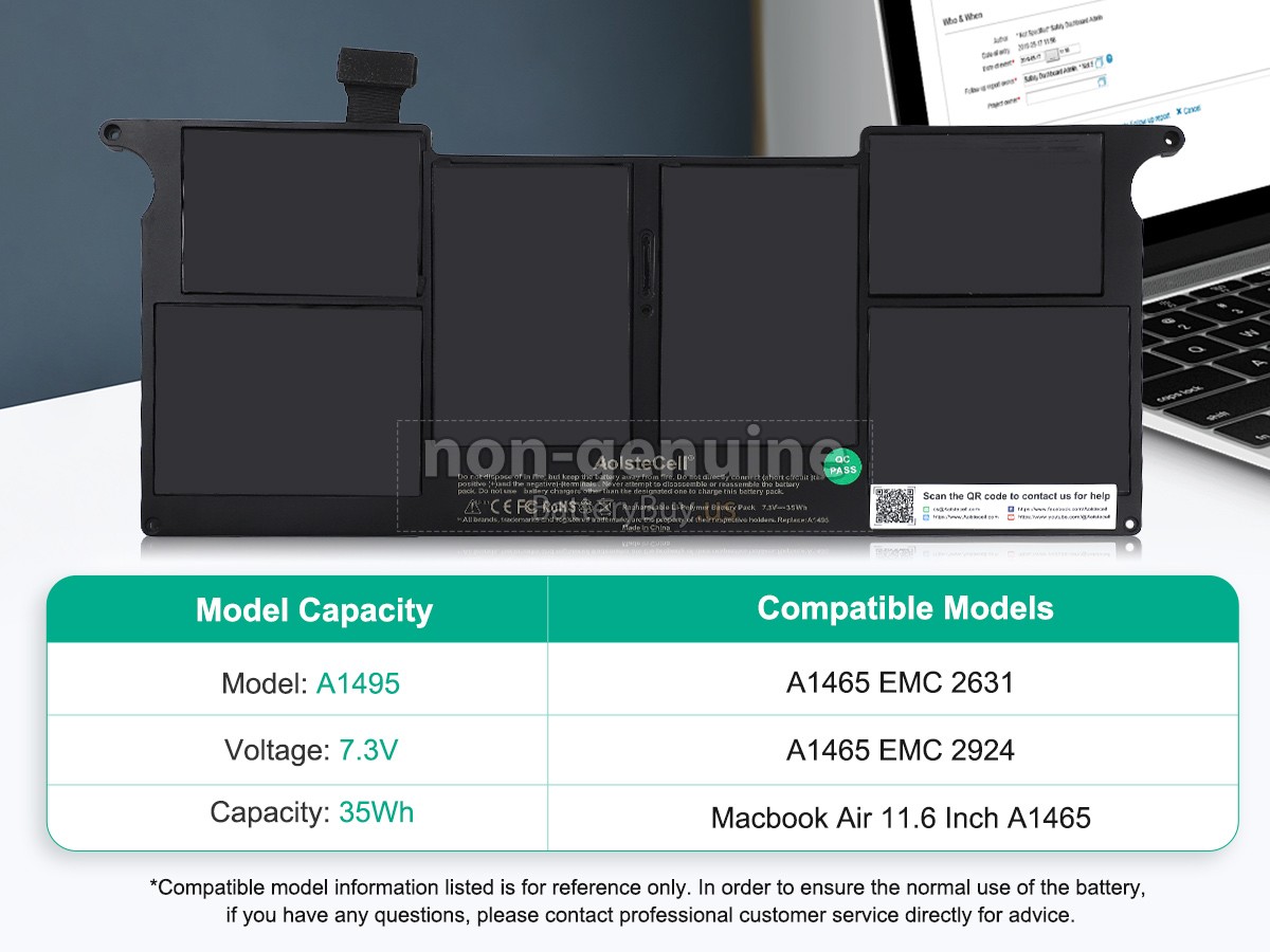 A: Through the product compatibility table, you can check if Apple MacBook Air Core I5 1.6GHZ 11.6 inch A1465(EMC 2924) replacement battery is compatible with your laptop model. Clicking product larger Images, you can confirm the selected correctness of Apple MacBook Air Core I5 1.6GHZ 11.6 inch A1465(EMC 2924) laptop battery. What's more, please pay attention to check if the voltage (rated value) is the same as your old one. For more details, please click How to find one correct battery for my laptop?