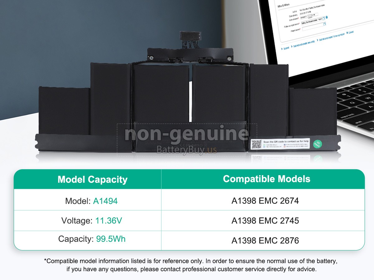 A: Through the product compatibility table, you can check if Apple MacBook Pro Core I7 2.8GHZ 15.4 inch Retina A1398(EMC 2876) replacement battery is compatible with your laptop model. Clicking product larger Images, you can confirm the selected correctness of Apple MacBook Pro Core I7 2.8GHZ 15.4 inch Retina A1398(EMC 2876) laptop battery. What's more, please pay attention to check if the voltage (rated value) is the same as your old one. For more details, please click How to find one correct battery for my laptop?
