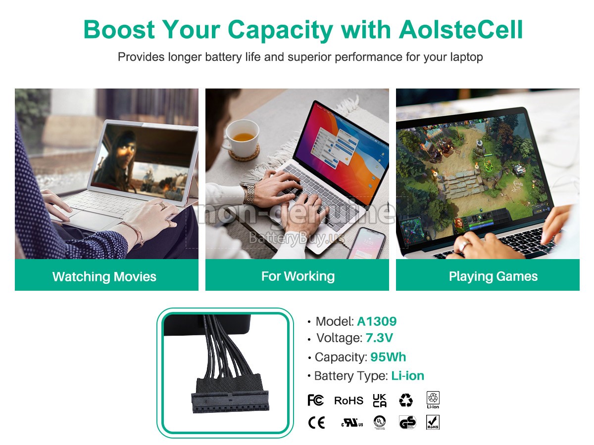 With first-class quality assurance, the battery for Apple MC226LL/A provides protections of voltage, short circuit, charging time, ESD, and so on. Each Apple MC226LL/A laptop battery has passed a series of safety certifications, such as CE, UL, ROHS, ISO9001/9002. It will be rigorously tested by our technicians before being shipped to your hands. We will try our best to select a high-quality Apple MC226LL/A battery for you.
