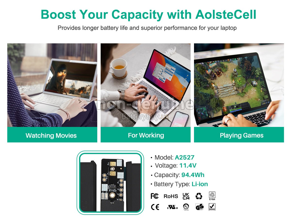 With first-class quality assurance, the battery for Apple MK1H3LL/A provides protections of voltage, short circuit, charging time, ESD, and so on. Each Apple MK1H3LL/A laptop battery has passed a series of safety certifications, such as CE, UL, ROHS, ISO9001/9002. It will be rigorously tested by our technicians before being shipped to your hands. We will try our best to select a high-quality Apple MK1H3LL/A battery for you.