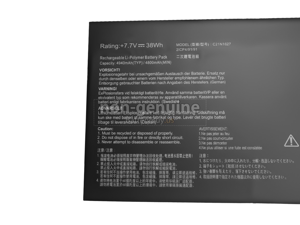 The replacement battery for Asus C21N1627(21CP4/91/91) from BatteryBuy.us will be your best choice. We offer a high-quality laptop battery at a more reasonable price. Our Asus C21N1627(21CP4/91/91) batteries can be charged/discharged for at least 600 cycles. Being made of ABS plastic case and the original IC protection chip, it could give you the new experience of excellent durability.