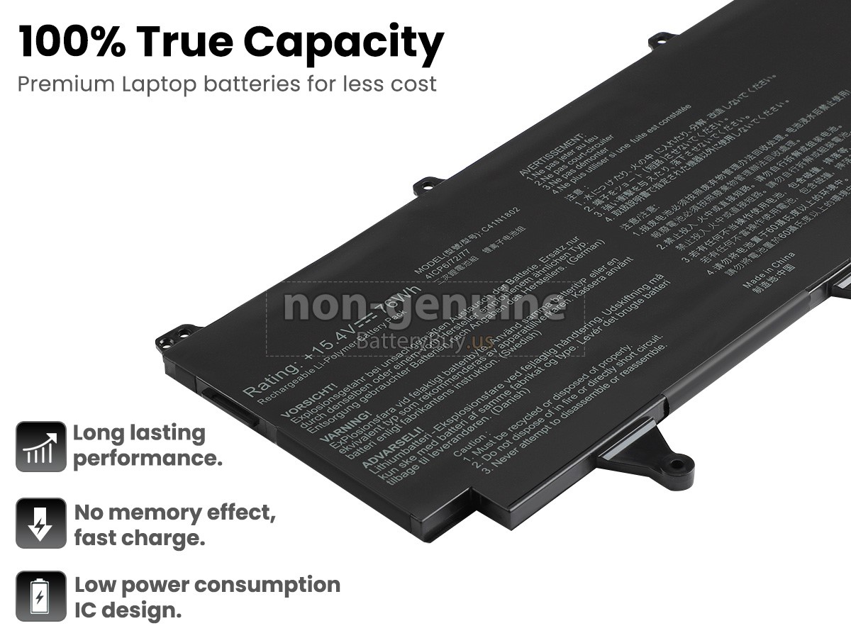 With first-class quality assurance, the battery for Asus Rog ZEPHYRUS S GX735GXR-6100T provides protections of voltage, short circuit, charging time, ESD, and so on. Each Asus Rog ZEPHYRUS S GX735GXR-6100T laptop battery has passed a series of safety certifications, such as CE, UL, ROHS, ISO9001/9002. It will be rigorously tested by our technicians before being shipped to your hands. We will try our best to select a high-quality Asus Rog ZEPHYRUS S GX735GXR-6100T battery for you.