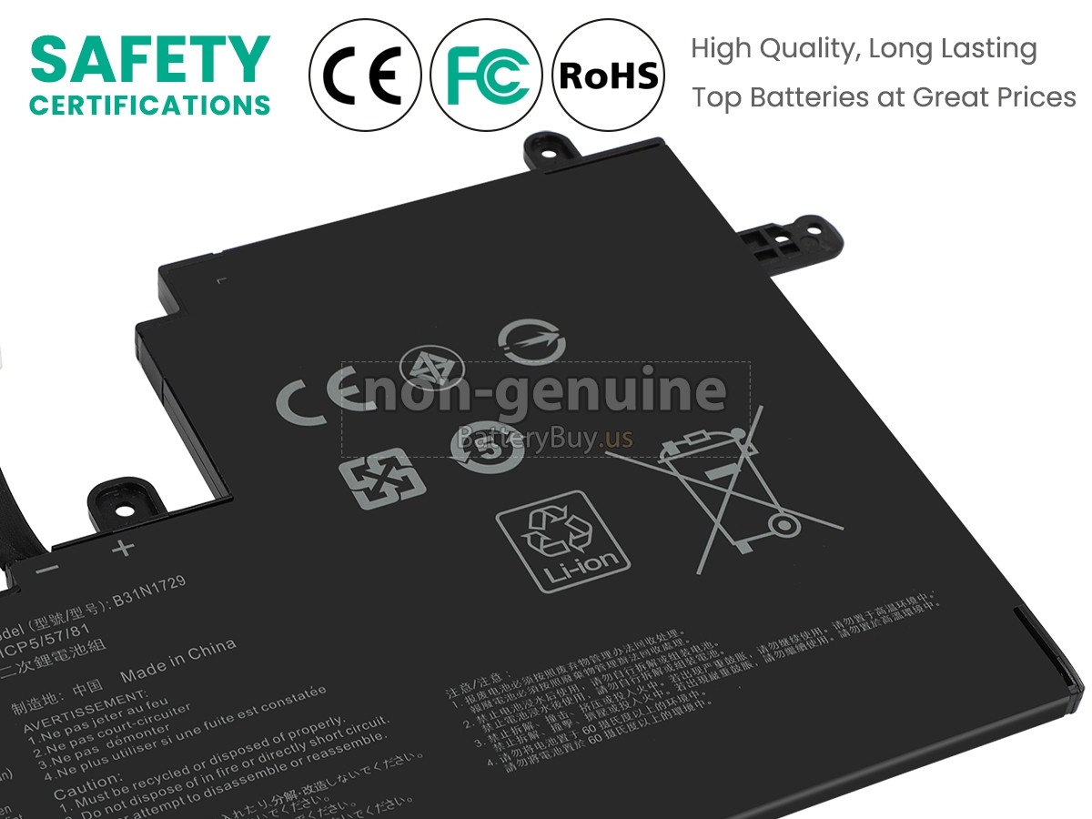 With first-class quality assurance, the battery for Asus VivoBook S530FN-BQ370T provides protections of voltage, short circuit, charging time, ESD, and so on. Each Asus VivoBook S530FN-BQ370T laptop battery has passed a series of safety certifications, such as CE, UL, ROHS, ISO9001/9002. It will be rigorously tested by our technicians before being shipped to your hands. We will try our best to select a high-quality Asus VivoBook S530FN-BQ370T battery for you.