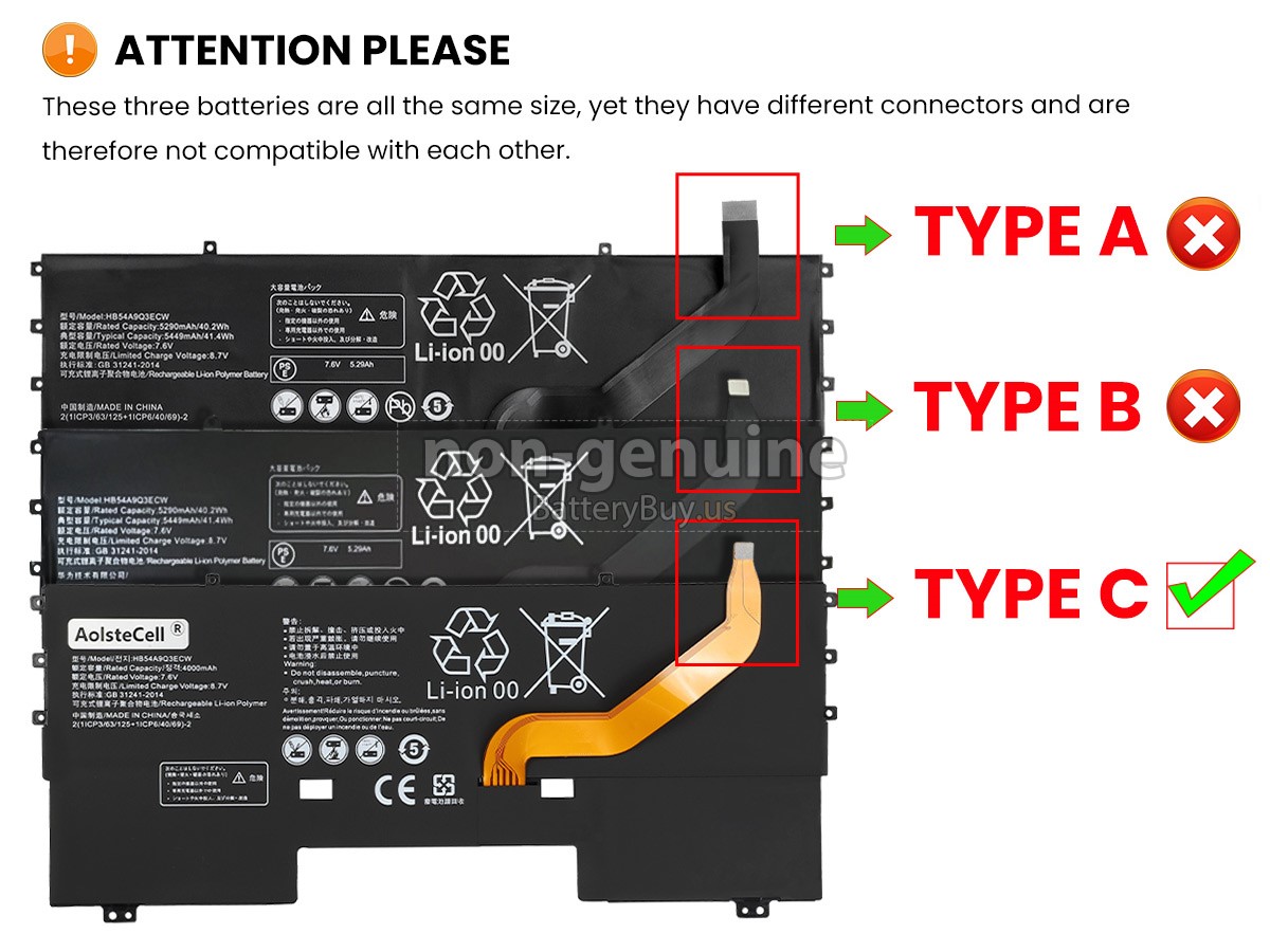 There are 3 types battery named "HB54A9Q3ECW", before placing an order please check your old battery first, ensure the connector is same to our battery Type A. - SKUBUS1094