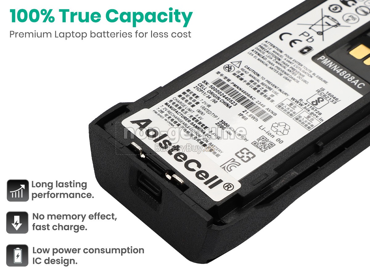 With first-class quality assurance, the battery for Motorola PMNN4807 provides protections of voltage, short circuit, charging time, ESD, and so on. Each Motorola PMNN4807 battery has passed a series of safety certifications, such as CE, UL, ROHS, ISO9001/9002. It will be rigorously tested by our technicians before being shipped to your hands. We will try our best to select a high-quality Motorola PMNN4807 battery for you.