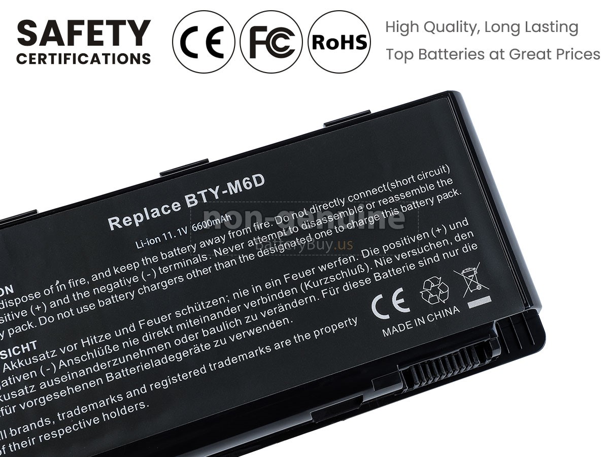 With first-class quality assurance, the battery for MSI GX780R-024CS provides protections of voltage, short circuit, charging time, ESD, and so on. Each MSI GX780R-024CS laptop battery has passed a series of safety certifications, such as CE, UL, ROHS, ISO9001/9002. It will be rigorously tested by our technicians before being shipped to your hands. We will try our best to select a high-quality MSI GX780R-024CS battery for you.